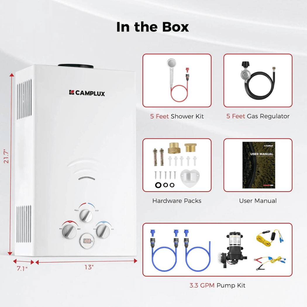 - Easy to Operate. Camplux water heater comes with one-step quick connect gas regulator,11.5 feet extension shower hose,pressurizer water pump and pipe strainer. You can take the Camplux wherever you can take a propane bottle.